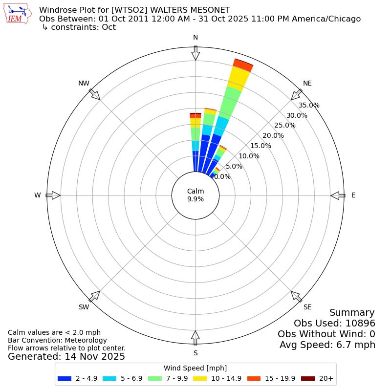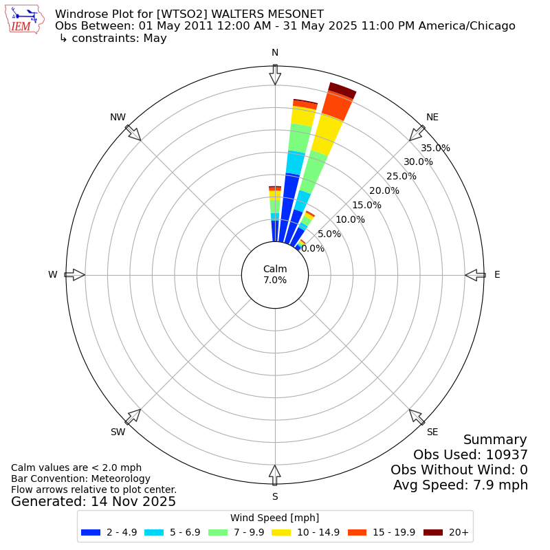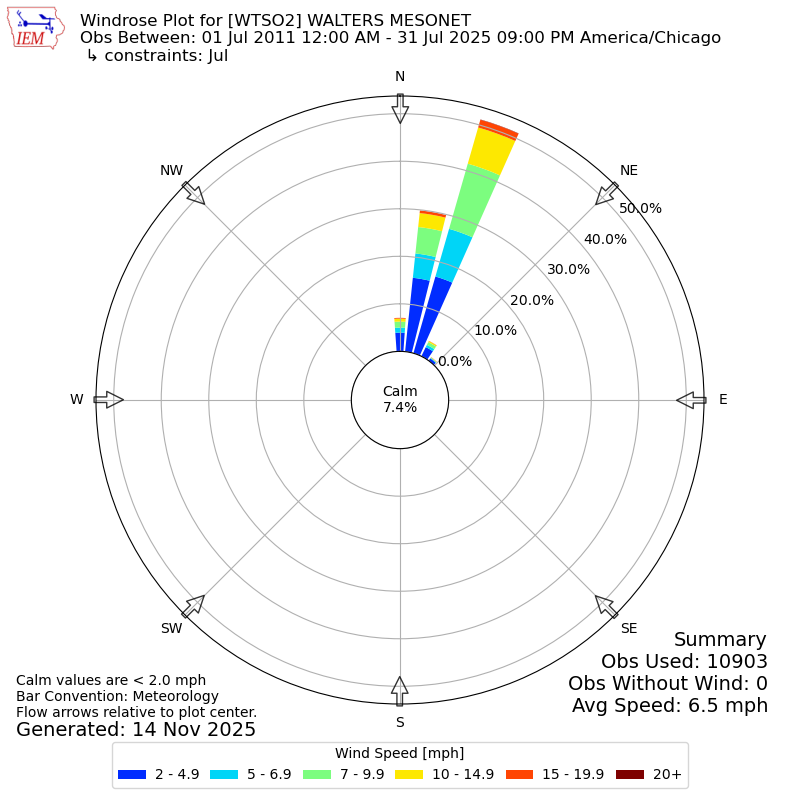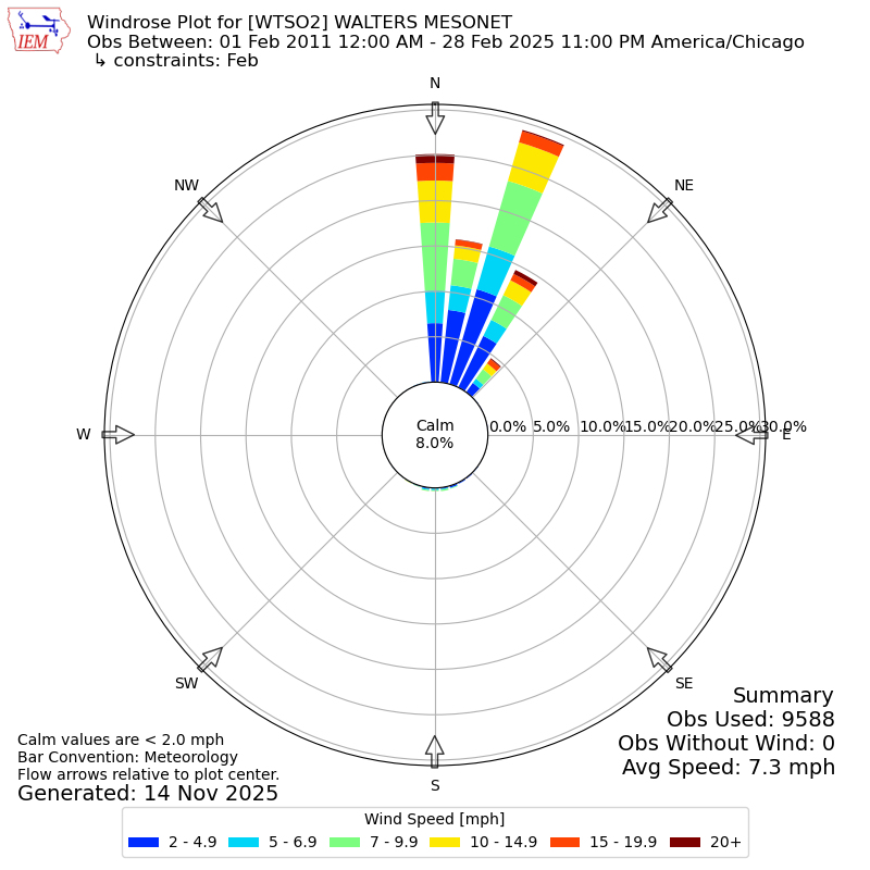 The IEM has generated these wind roses based on our archive. The archive does contain errors and non-representative data, so please use care when using these plots. In general, data from airports is of good quality and representative of the local surrounding area.