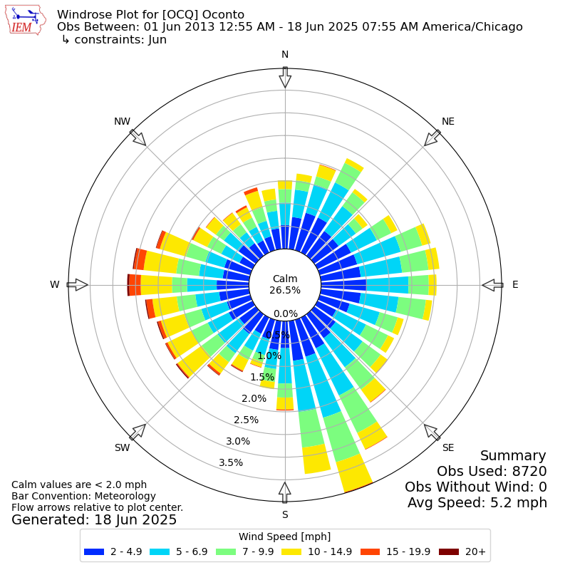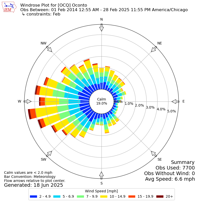 The IEM has generated these wind roses based on our archive. The archive does contain errors and non-representative data, so please use care when using these plots. In general, data from airports is of good quality and representative of the local surrounding area.