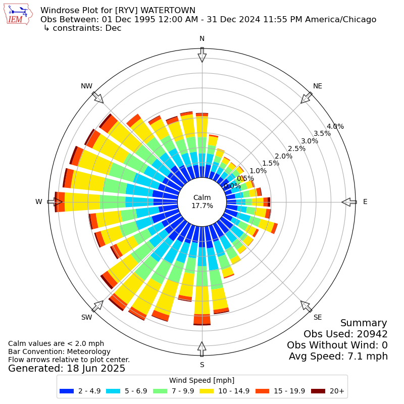 The IEM has generated these wind roses based on our archive. The archive does contain errors and non-representative data, so please use care when using these plots. In general, data from airports is of good quality and representative of the local surrounding area.