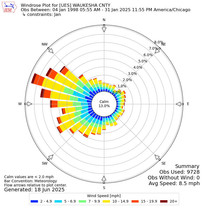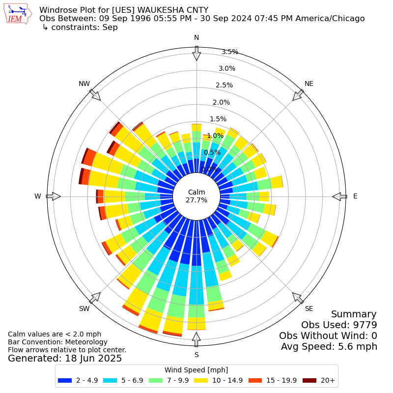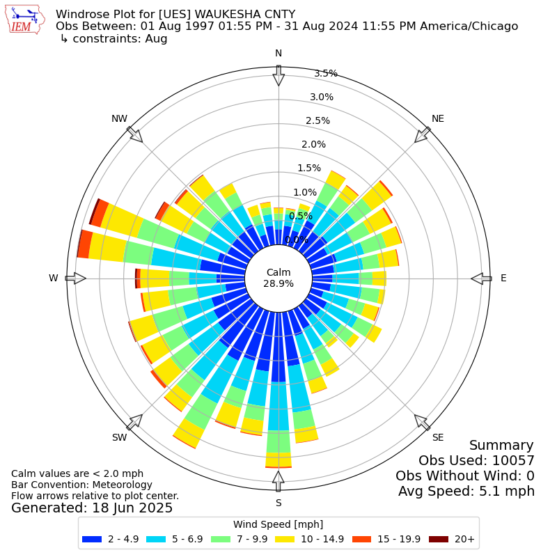 Wind roses are information-packed plots providing frequencies of wind direction and wind speed. They quickly indicate dominant wind directions and the direction of strongest wind speeds.