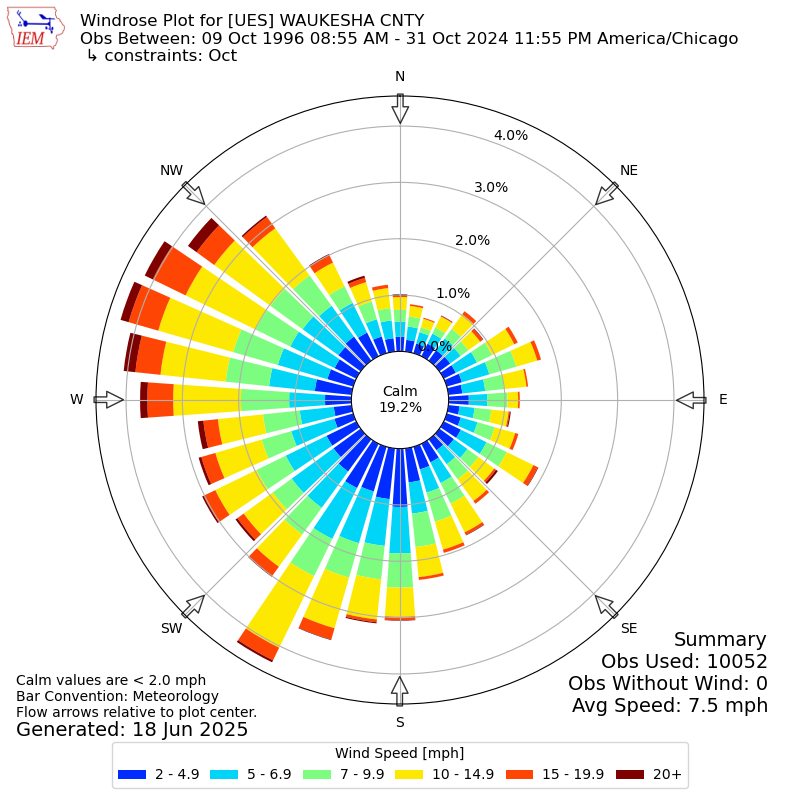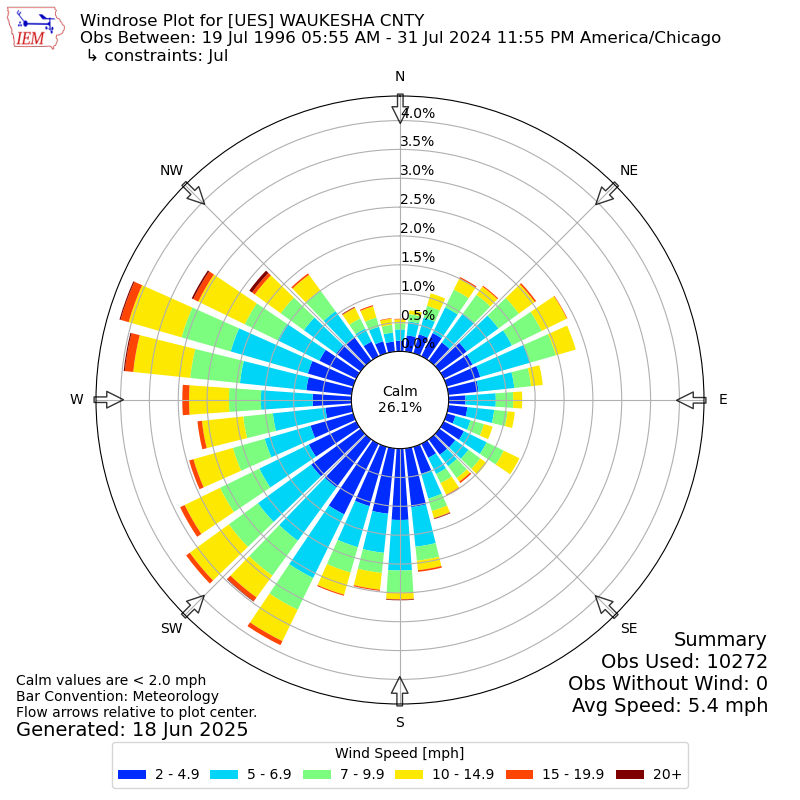 The IEM has generated these wind roses based on our archive. The archive does contain errors and non-representative data, so please use care when using these plots. In general, data from airports is of good quality and representative of the local surrounding area.